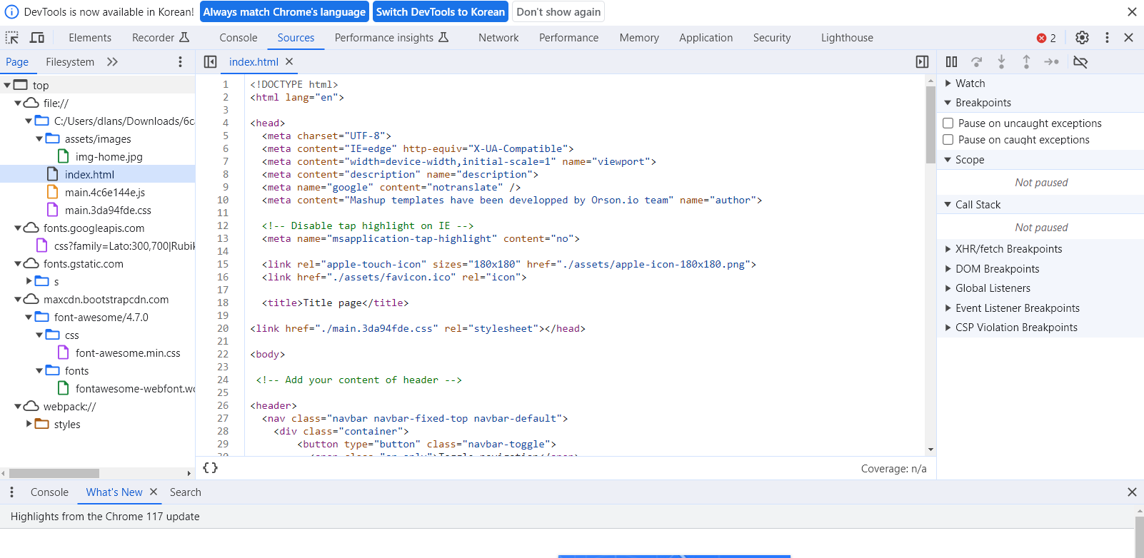 이런 파일들이 있는것을 확인할 수 있고 그 중에 index.html이라는 파일을 알 수 있습니다. 해당 html을 먼저 열어봅시다. index.html은 보통 웹 페이지의 메인 페이지를 뜻하는데 이는 예전에 웹 서버의 목차 역할을 하는 페이지가 index.html이라고 이름지은게 지금까지 내려온 전통(?)이라고 할 수 있습니다.