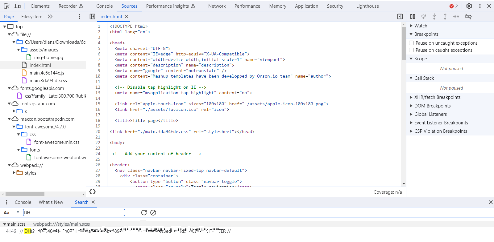 개발자 도구의 Sources 탭 기능을 활용해 플래그를 찾아보세요. 플래그 형식은 DH{...} 입니다. Reference Tools: Browser DevTools